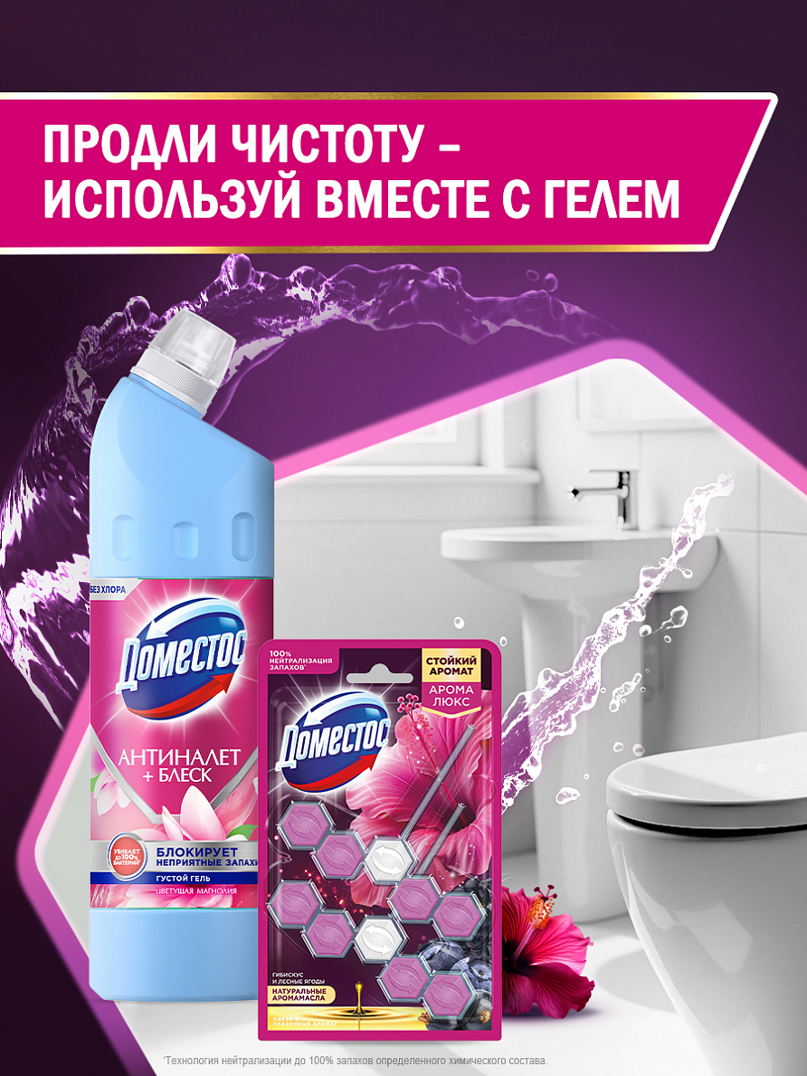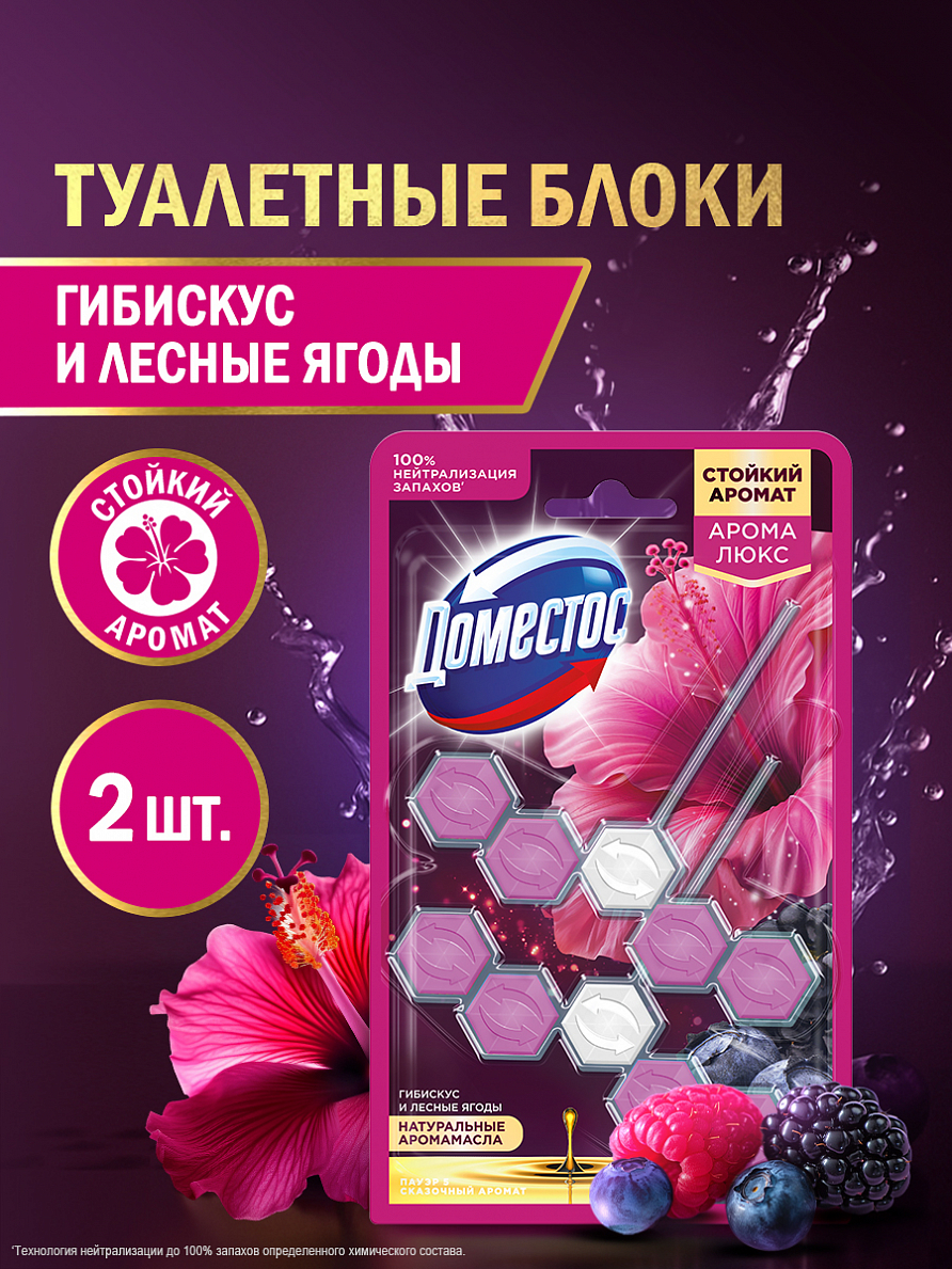 Арома-блок для очищения туалета Доместос Арома Люкс Сказочный аромат блокировка неприятного запаха — это пять преимуществ, помогающих обеспечить блокировку неприятных запахов 24/7', защиту от загрязнений и микробов и сохранить чистоту и блеск. При каждом смывании появляется свежий аромат пряного гибискуса и сочных лесных ягод на срок 24 часов' и обильная пена, которая борется с налетом, поддерживая гигиену и блеск поверхности унитаза. С новыми ароматами от Доместос можно наслаждаться приятными и яркими ароматами цветов, фруктов и ягод не выходя из дома.Блок Доместос для унитаза содержит активное вещество, которое под действием напора воды ополаскивает всю поверхность унитаза, защищая от бактерий и помогая предотвращать известковый налет.Блок для туалета Доместос Арома Люкс Сказочный аромат:-блокировка неприятных запахов 24/7'-защита от микробов 24/7 ''-предотвращает известковый налет;-удаляет грязь обильной пеной;-оставляет блеск и яркий долгий аромат после смывания;-содержит арома масла-содержит 2 блока в упаковке;-работает до 1,5 раз дольше*.Продукция Доместос представлена в разных сегментах рынка средств для уборки: чистящие гели, туалетные блоки, универсальные спреи, антибактериальные салфетки. Доместос убивает все известные микробы, помогая обеспечить гигиену дома. На сегодняшний день Доместос уверенно занимает одну из лидирующих позиций** на рынке чистящих средств.' Действие 24 часа, 7 дней в неделю, при наличие блока. Инструментальные тесты Арнест ЮниРусь (Англия, 2021). '' Защита от загрязнений, благоприятной среды для микробов 24 часа, 7 дней в неделю, при наличии блока*По результатам тестов Арнест ЮниРусь по сравнению со стикером для очищения унитаза Доместос.**Источник: AC Nielsen, в денежном выражении, категория бытовой химии, Россия, Апрель 2016 — Март 2017.