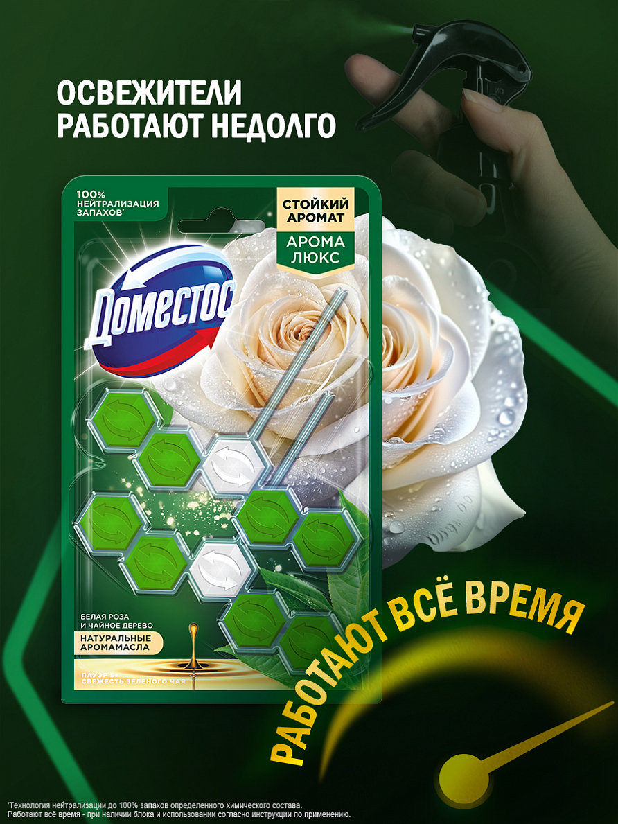 Арома-блок для очищения туалета Доместос Арома Люкс Свежесть зеленого чая, блокировка неприятного запаха — это пять преимуществ, помогающих обеспечить блокировку неприятных запахов 24/7', защиту от загрязнений и микробов и сохранить чистоту и блеск. При каждом смывании появляется нежный аромат свежей белой розы и масла чайного дерева на срок 24 часов' и обильная пена, которая борется с налетом, поддерживая гигиену и блеск поверхности унитаза. С новыми ароматами от Доместос можно наслаждаться приятными и яркими ароматами цветов, фруктов и ягод не выходя из дома.Блок Доместос для унитаза содержит активное вещество, которое под действием напора воды ополаскивает всю поверхность унитаза, защищая от бактерий и помогая предотвращать известковый налет.Блок для туалета Доместос Арома Люкс Свежесть зеленого чая:-блокировка неприятных запахов 24/7'-защита от микробов 24/7 ''-предотвращает известковый налет;-удаляет грязь обильной пеной;-оставляет блеск и яркий долгий аромат после смывания;-содержит арома масла-содержит 2 блока в упаковке;-работает до 1,5 раз дольше*.Продукция Доместос представлена в разных сегментах рынка средств для уборки: чистящие гели, туалетные блоки, универсальные спреи, антибактериальные салфетки. Доместос убивает все известные микробы, помогая обеспечить гигиену дома. На сегодняшний день Доместос уверенно занимает одну из лидирующих позиций** на рынке чистящих средств.' Действие 24 часа, 7 дней в неделю, при наличие блока. Инструментальные тесты Арнест ЮниРусь (Англия, 2021). '' Защита от загрязнений, благоприятной среды для микробов 24 часа, 7 дней в неделю, при наличии блока*По результатам тестов Арнест ЮниРусь по сравнению со стикером для очищения унитаза Доместос.**Источник: AC Nielsen, в денежном выражении, категория бытовой химии, Россия, Апрель 2016 — Март 2017.
