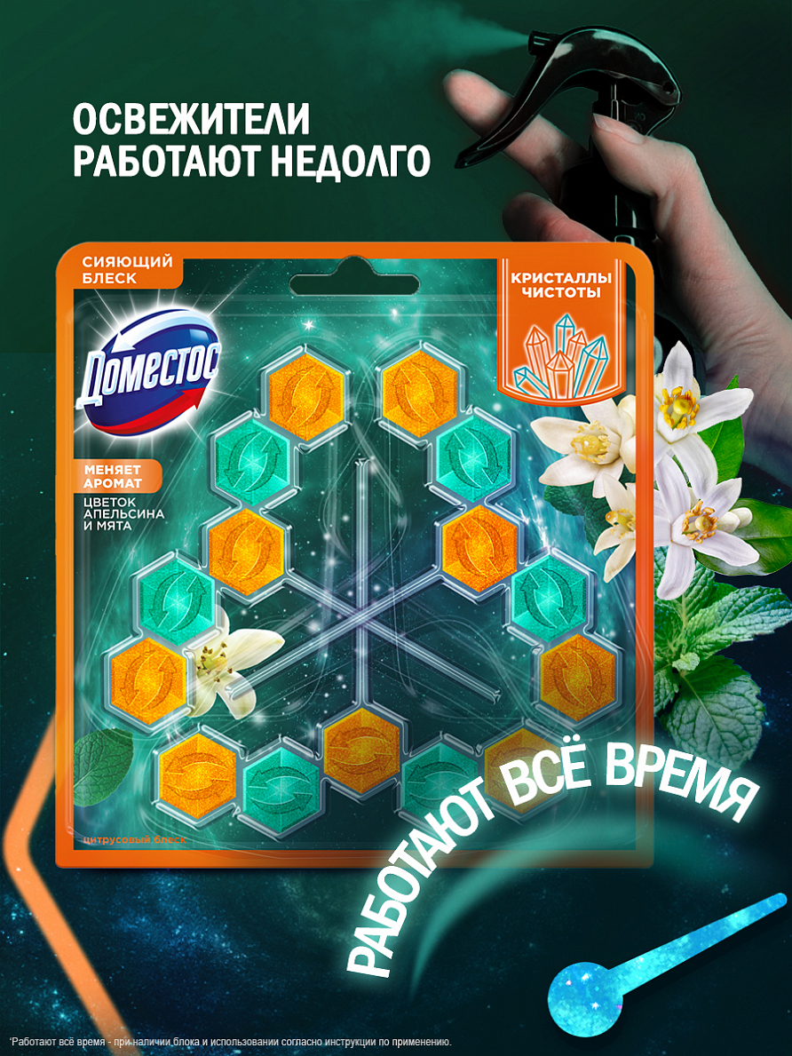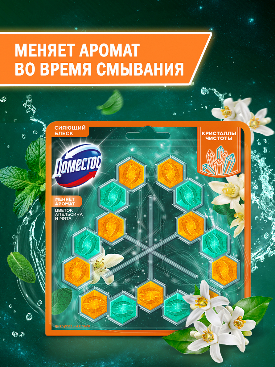 • Вскройте пластиковую упаковку и достаньте блок • Поместите блок под ободок унитаза в место наиболее сильного потока воды с помощью держателя (предварительно разорвав перемычку при ее наличии). • По окончании использования блока выбросите его в мусорное ведро и установите новый блок Доместос • Тщательно вымойте руки