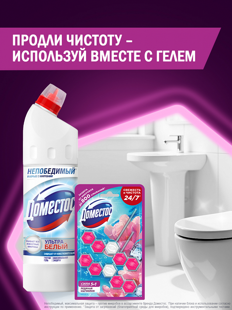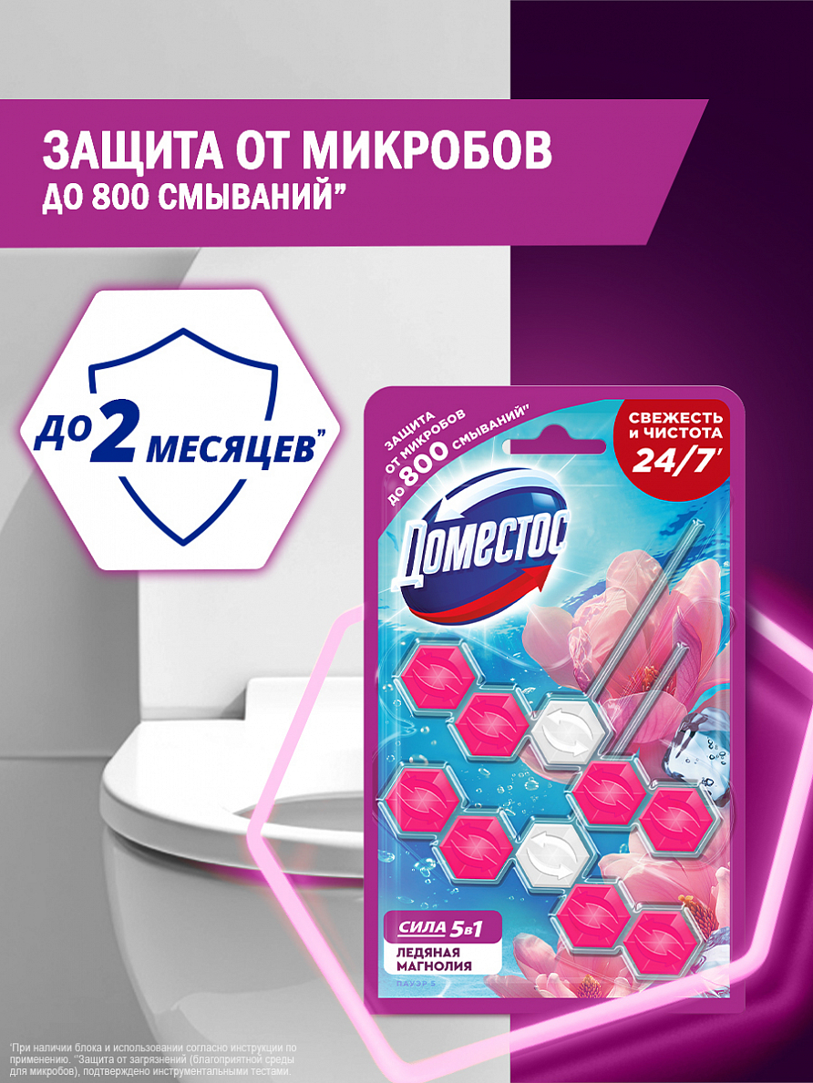 Блок для туалета Доместос Сила 5в1 Антиналет Ледяная магнолия против известкового налета и неприятного запаха — это пять преимуществ, помогающих обеспечить защиту от загрязнений и микробов и сохранить чистоту и блеск. При каждом смывании появляется яркий аромат магнолии на срок до 4 часов и обильная пена, которая борется с налетом, поддерживая гигиену и блеск поверхности унитаза.Блок для унитаза для унитаза Доместос содержит активное вещество, которое под действием напора воды ополаскивает всю поверхность унитаза, защищая от бактерий и помогая предотвращать известковый налет.Блок для унитаза Доместос Сила 5в1 Антиналет Ледяная магнолия:-предотвращает известковый налет;-борется с неприятными запахами;-удаляет грязь и микробы обильной пеной;-оставляет приятный аромат после смывания;-содержит 2 блока в упаковке;-работает до 1,5 раз дольше*.Продукция Доместос представлена в разных сегментах рынка средств для уборки: чистящие гели, туалетные блоки, универсальные спреи, антибактериальные салфетки. Доместос убивает все известные микробы, помогая обеспечить гигиену дома. На сегодняшний день Доместос уверенно занимает одну из лидирующих позиций**.*По результатам тестов Арнест ЮниРусь по сравнению со стикером для очищения унитаза Доместос.**Источник: AC Nielsen, в денежном выражении, категория бытовой химии, Россия, Апрель 2016 — Март 2017.