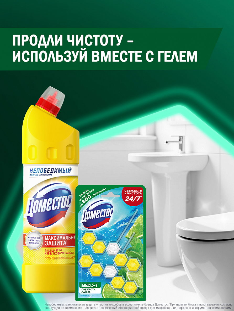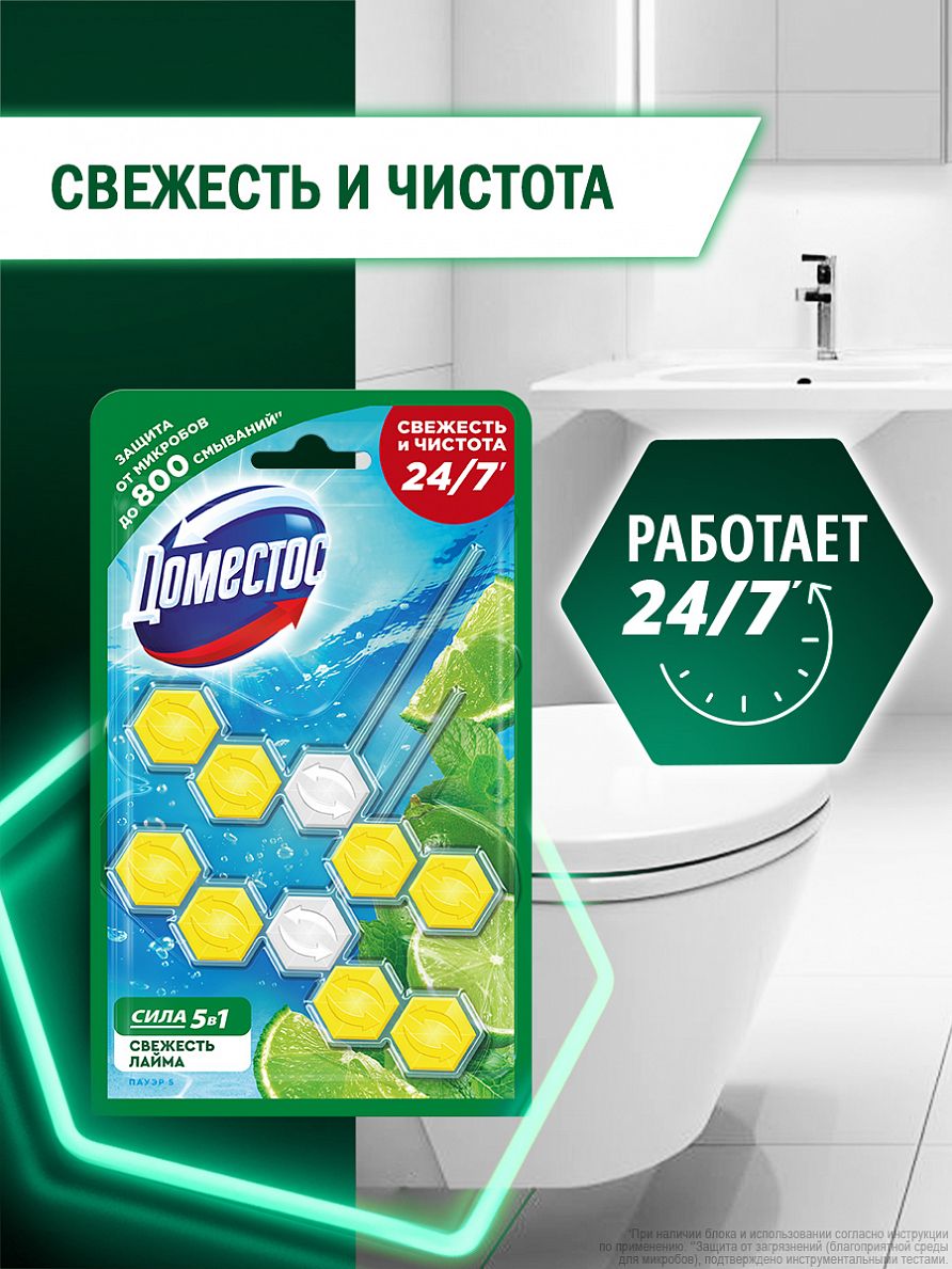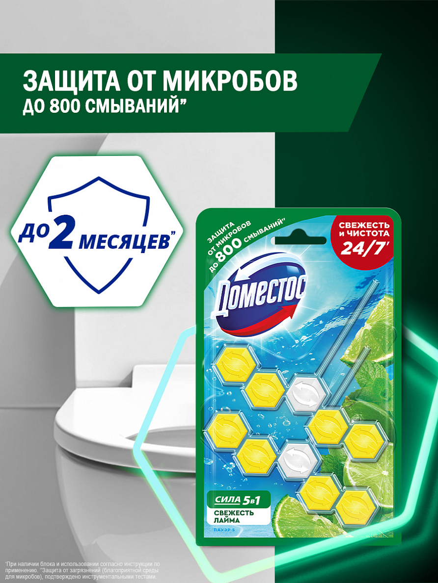 Блок для очищения унитаза Доместос Сила 5в1 Антиналет Свежесть Лайма против известкового налета и неприятного запаха — это пять преимуществ, помогающих обеспечить защиту от загрязнений и микробов и сохранить чистоту и блеск. При каждом смывании появляется бодрящий аромат лайма на срок до 4 часов и обильная пена, которая борется с налетом, поддерживая гигиену и блеск поверхности унитаза.Блок для туалета Доместос содержит активное вещество, которое под действием напора воды ополаскивает всю поверхность унитаза, защищая от бактерий и помогая предотвращать известковый налет.Блок для унитаза Доместос Сила 5в1 Антиналет Свежесть Лайма:-предотвращает известковый налет;-борется с неприятными запахами;-удаляет грязь и микробы обильной пеной;-оставляет приятный аромат после смывания;-содержит 2 блока в упаковке;-работает до 1,5 раз дольше*.Продукция Доместос представлена в разных сегментах рынка средств для уборки: чистящие гели, туалетные блоки, универсальные спреи, антибактериальные салфетки. Доместос убивает все известные микробы, помогая обеспечить гигиену дома. На сегодняшний день Доместос уверенно занимает одну из лидирующих позиций**.*По результатам тестов Арнест ЮниРусь по сравнению со стикером для очищения унитаза Доместос.**Источник: AC Nielsen, в денежном выражении, категория бытовой химии, Россия, Апрель 2016 — Март 2017.
