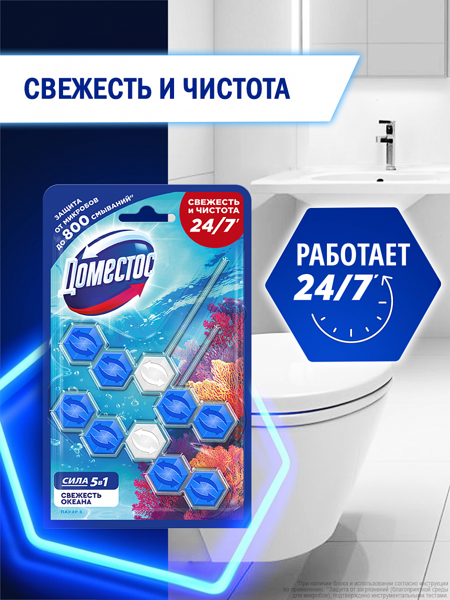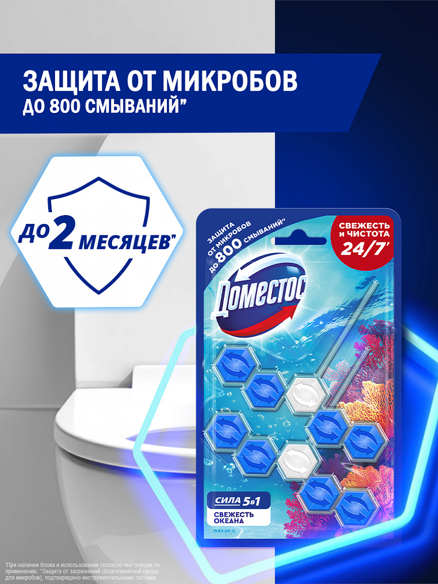 Блок для туалета Доместос Сила 5в1 Антиналет Свежесть океана против известкового налета и неприятного запаха — это пять преимуществ, помогающих обеспечить защиту от загрязнений и микробов и сохранить чистоту и блеск. При каждом смывании появляется свежий аромат океана на срок до 4 часов и обильная пена, которая борется с налетом, поддерживая гигиену и блеск поверхности унитаза.Подвесной блок для унитаза Доместос содержит активное вещество, которое под действием напора воды ополаскивает всю поверхность унитаза, защищая от бактерий и помогая предотвращать известковый налет.Блок для унитаза Доместос Сила 5в1 Антиналет Свежесть океана:-предотвращает известковый налет;-борется с неприятными запахами;-удаляет грязь и микробы обильной пеной;-оставляет приятный аромат после смывания;-содержит 2 блока в упаковке;-работает до 1,5 раз дольше*.Продукция Доместос представлена в разных сегментах рынка средств для уборки: чистящие гели, туалетные блоки, универсальные спреи, антибактериальные салфетки. Доместос убивает все известные микробы, помогая обеспечить гигиену дома. На сегодняшний день Доместос уверенно занимает одну из лидирующих позиций**.*По результатам тестов Арнест ЮниРусь по сравнению со стикером для очищения унитаза Доместос.**Источник: AC Nielsen, в денежном выражении, категория бытовой химии, Россия, Апрель 2016 — Март 2017.