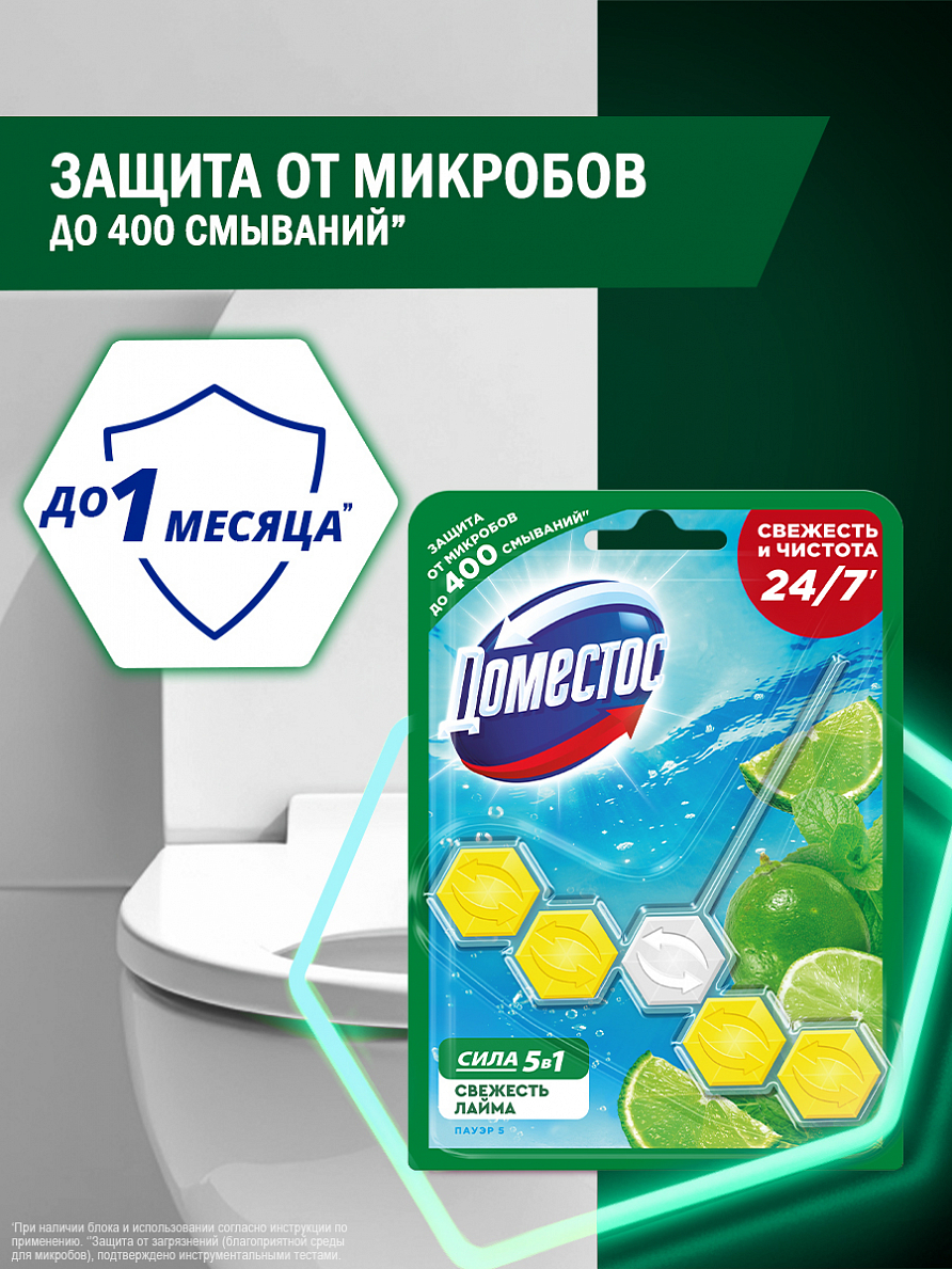 Блок для очищения туалета Доместос Сила 5в1 Свежесть лайма защита от микробов, известкового налета и неприятного запаха — это пять преимуществ, помогающих обеспечить защиту от загрязнений и микробов и сохранить чистоту и блеск. При каждом смывании появляется свежий аромат лайма на срок до 4 часов и обильная пена, которая борется с налетом, поддерживая гигиену и блеск поверхности унитаза.Блок Доместос для унитаза содержит активное вещество, которое под действием напора воды ополаскивает всю поверхность унитаза, защищая от бактерий и помогая предотвращать известковый налет.Блок для туалета Доместос Сила 5в1 Свежесть лайма:-защита от микробов до 400 смываний-предотвращает известковый налет;-борется с неприятными запахами;-удаляет грязь обильной пеной;-оставляет блеск и приятный аромат после смывания;-содержит 1 блок в упаковке;-работает до 1,5 раз дольше*.Продукция Доместос представлена в разных сегментах рынка средств для уборки: чистящие гели, туалетные блоки, универсальные спреи, антибактериальные салфетки. Доместос убивает все известные микробы, помогая обеспечить гигиену дома. На сегодняшний день Доместос уверенно занимает одну из лидирующих позиций** на рынке чистящих средств.*По результатам тестов Арнест ЮниРусь по сравнению со стикером для очищения унитаза Доместос.**Источник: AC Nielsen, в денежном выражении, категория бытовой химии, Россия, Апрель 2016 — Март 2017.