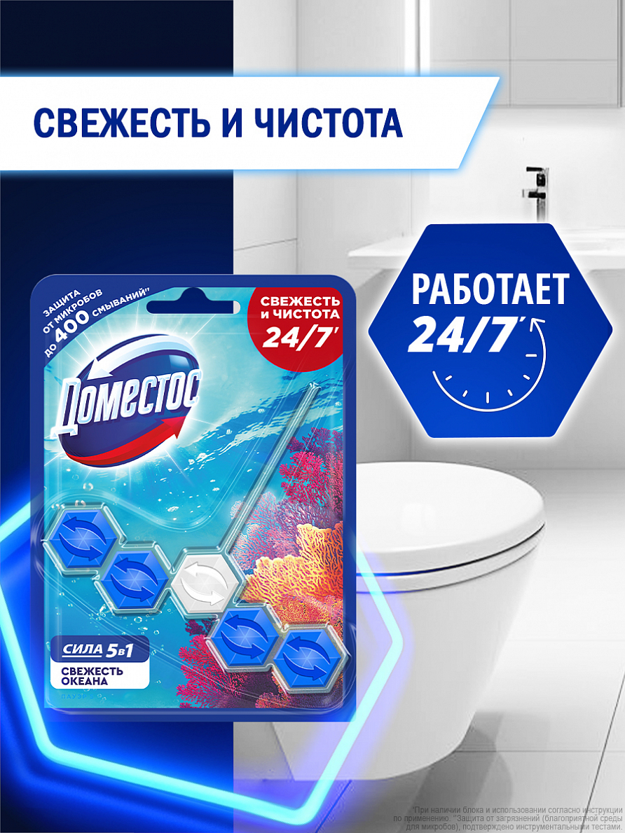 Блок для очищения туалета Доместос Сила 5в1 Свежесть океана против известкового налета и неприятного запаха — это пять преимуществ, помогающих обеспечить защиту от загрязнений и микробов и сохранить чистоту и блеск. При каждом смывании появляется бодрящий аромат океана на срок до 4 часов и обильная пена, которая борется с налетом, поддерживая гигиену и блеск поверхности унитаза.Блок для унитаза Доместос содержит активное вещество, которое под действием напора воды ополаскивает всю поверхность унитаза, защищая от бактерий и помогая предотвращать известковый налет.Блок для туалета Доместос Сила 5в1 Свежесть океана:-предотвращает известковый налет;-борется с неприятными запахами;-удаляет грязь и микробы обильной пеной;-оставляет приятный аромат после смывания;-содержит 1 блок в упаковке;-работает до 1,5 раз дольше*.Продукция Доместос представлена в разных сегментах рынка средств для уборки: чистящие гели, туалетные блоки, универсальные спреи, антибактериальные салфетки. Доместос убивает все известные микробы, помогая обеспечить гигиену дома. На сегодняшний день Доместос уверенно занимает одну из лидирующих позиций** на рынке чистящих средств.*По результатам тестов Арнест ЮниРусь по сравнению со стикером для очищения унитаза Доместос.**Источник: AC Nielsen, в денежном выражении, категория бытовой химии, Россия, Апрель 2016 — Март 2017.