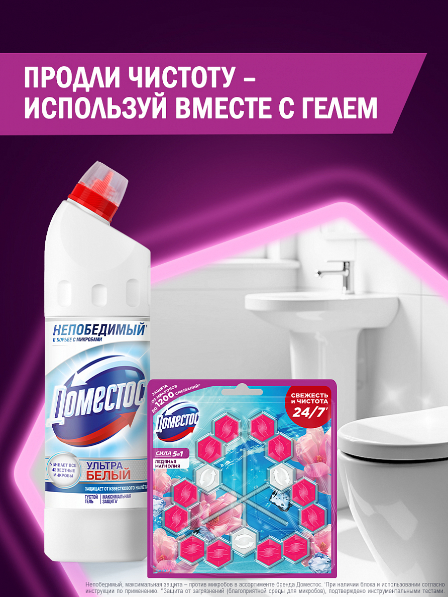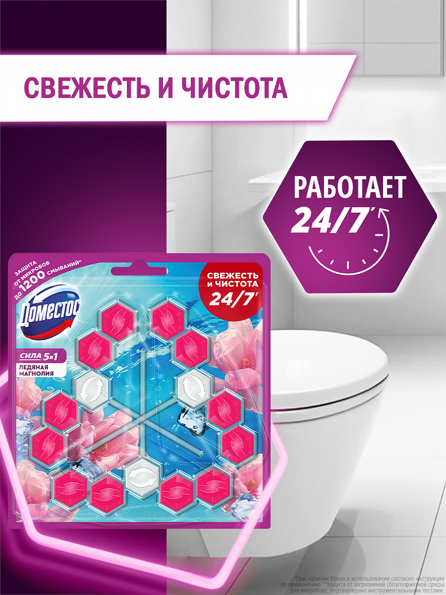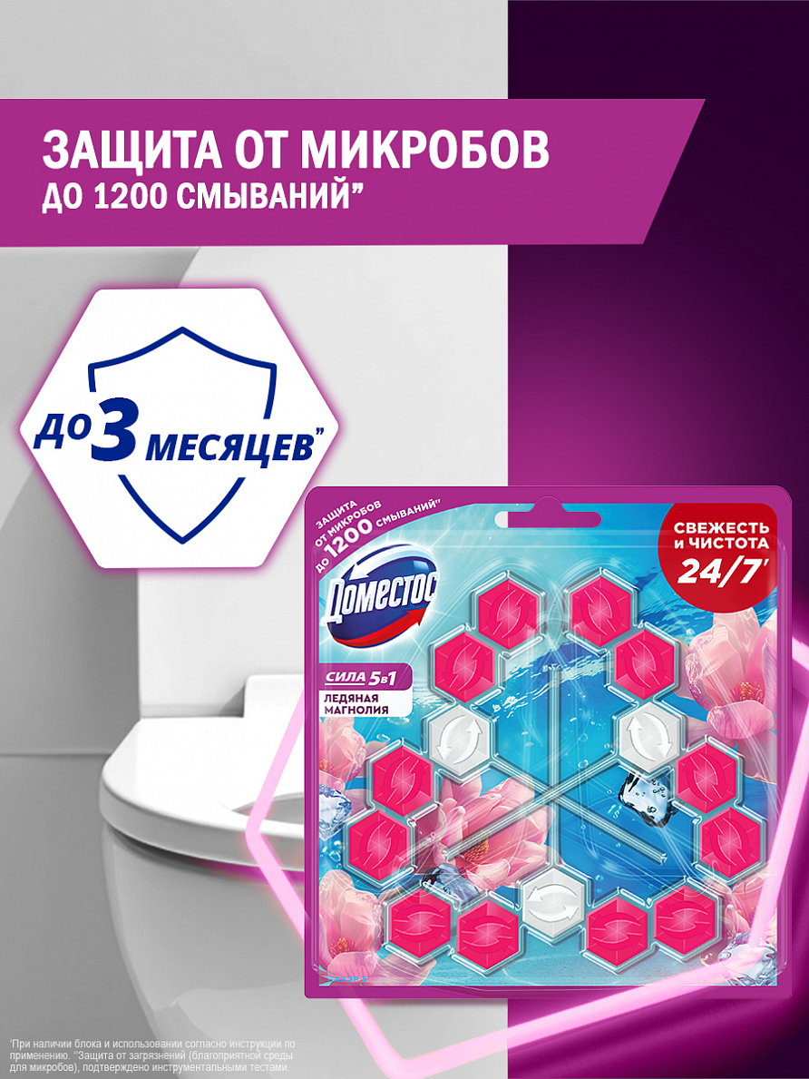 Блок для очищения туалета Доместос Сила 5в1 Ледяная магнолия против известкового налета и неприятного запаха — это пять преимуществ, помогающих обеспечить защиту от загрязнений и микробов и сохранить чистоту и блеск. При каждом смывании появляется свежий аромат магнолии на срок до 4 часов и обильная пена, которая борется с налетом, поддерживая гигиену и блеск поверхности унитаза.Блок для очищения унитаза Доместос содержит активное средство, которое под действием напора воды ополаскивает всю поверхность унитаза, защищая от бактерий и помогая предотвращать известковый налет.Блок для туалета Доместос Сила 5в1 Ледяная магнолия:-предотвращает известковый налет;-борется с неприятными запахами;-удаляет грязь и микробы обильной пеной;-оставляет приятный аромат после смывания;-содержит 3 сменных блока в одной упаковке;-работает до 1,5 раз дольше*.Продукция Доместос представлена в разных сегментах рынка средств для уборки: чистящие гели, туалетные блоки, универсальные спреи, антибактериальные салфетки. Доместос убивает все известные микробы, помогая обеспечить гигиену дома. На сегодняшний день Доместос уверенно занимает одну из лидирующих позиций** на рынке чистящих средств.*По результатам тестов Арнест ЮниРусь по сравнению со стикером для очищения унитаза Доместос.**Источник: AC Nielsen, в денежном выражении, категория бытовой химии, Россия, Апрель 2016 — Март 2017.