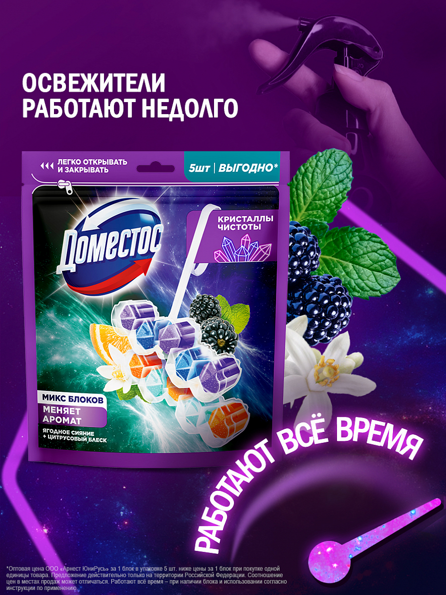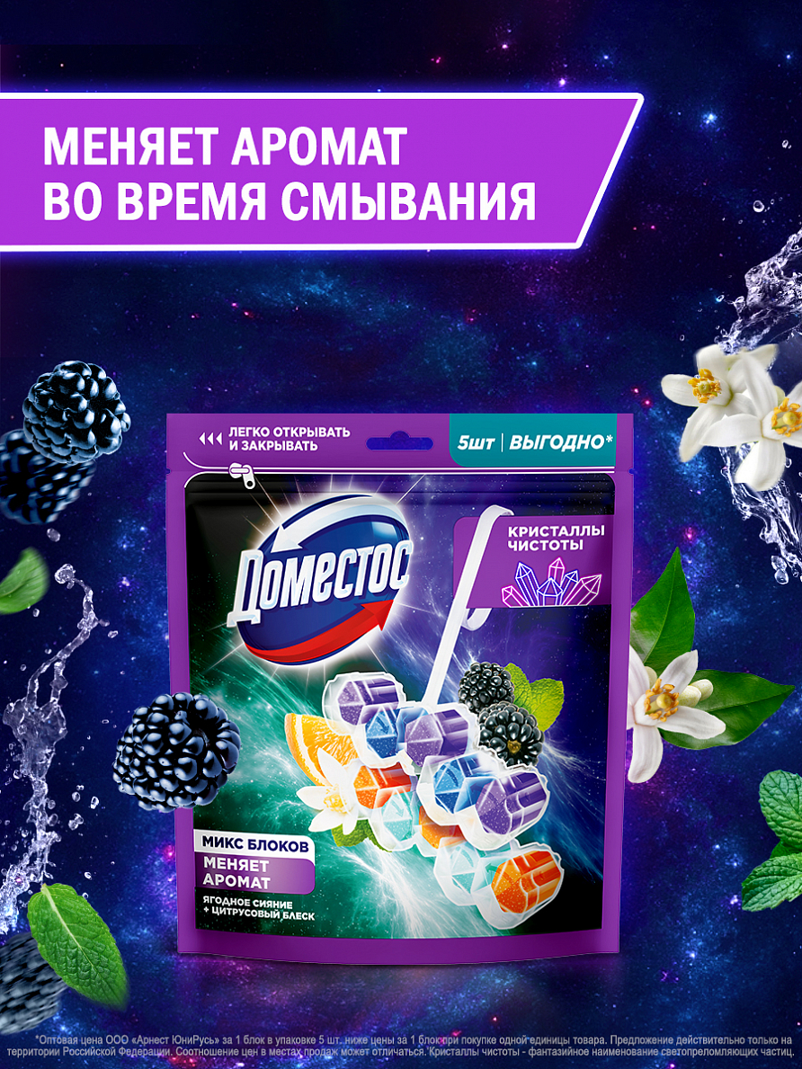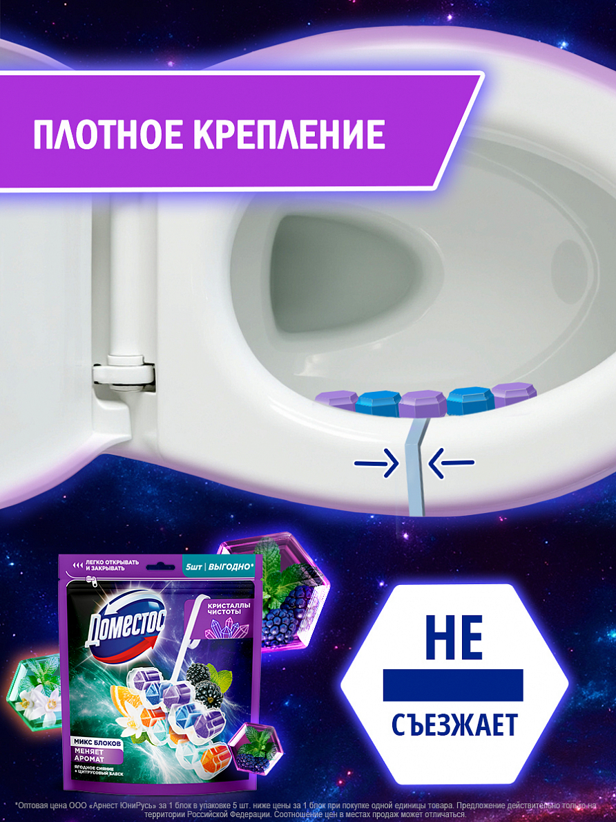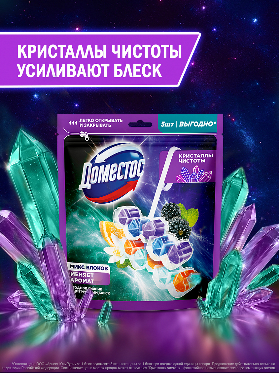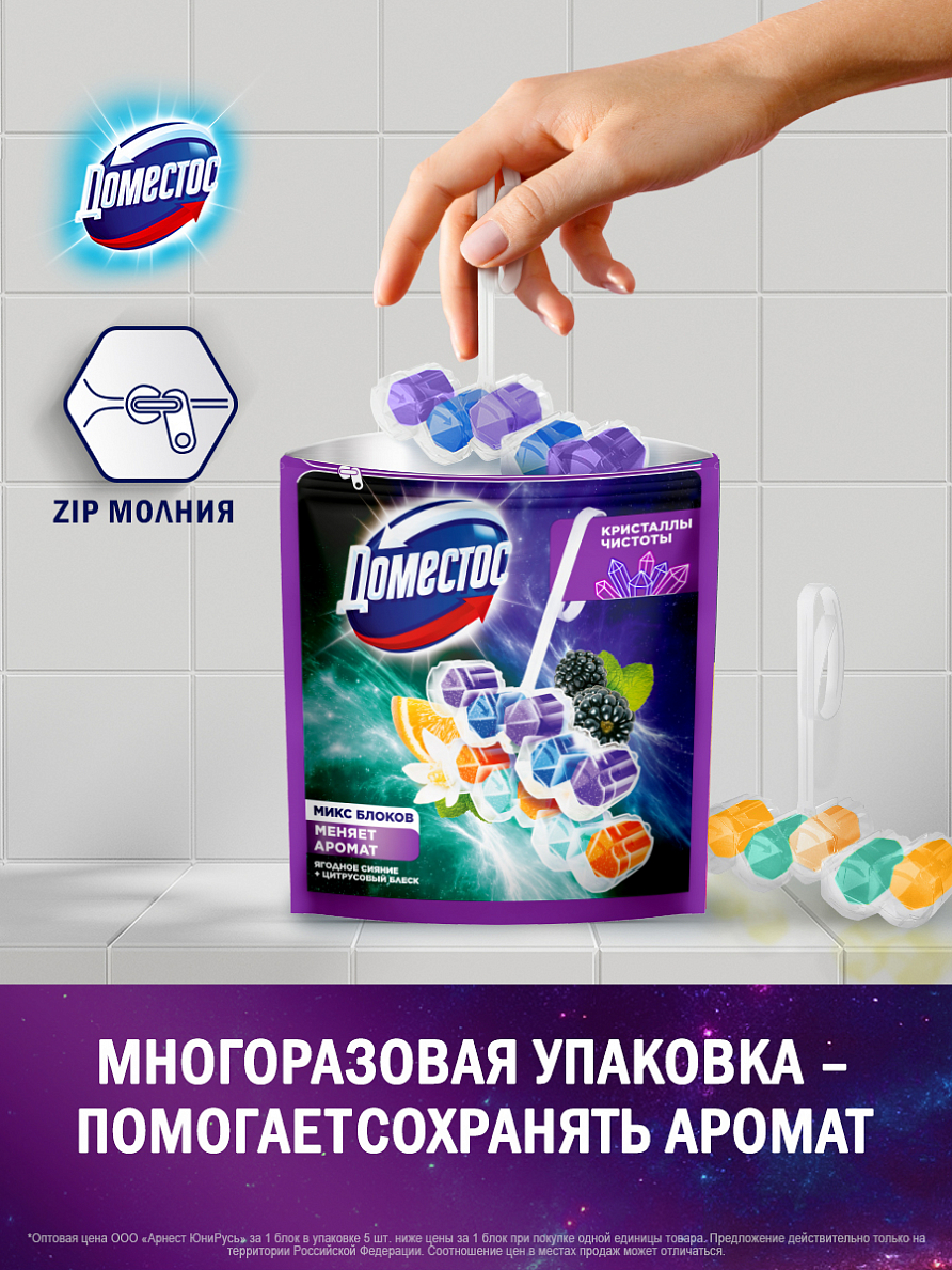 • Вскройте пластиковый пакет по пунктирной линии и достаньте блок • Поместите блок под ободок унитаза в место наиболее сильного потока воды с помощью держателя (предварительно разорвав перемычку при ее наличии). Для достижения максимального эффекта поместите продукт в место наиболее сильного потока воды при смыве • Храните оставшиеся блоки в закрытом пакете • По окончании использования блока выбросите его в мусорное ведро и установите новый блок Доместос Кристаллы чистоты • Тщательно вымойте руки