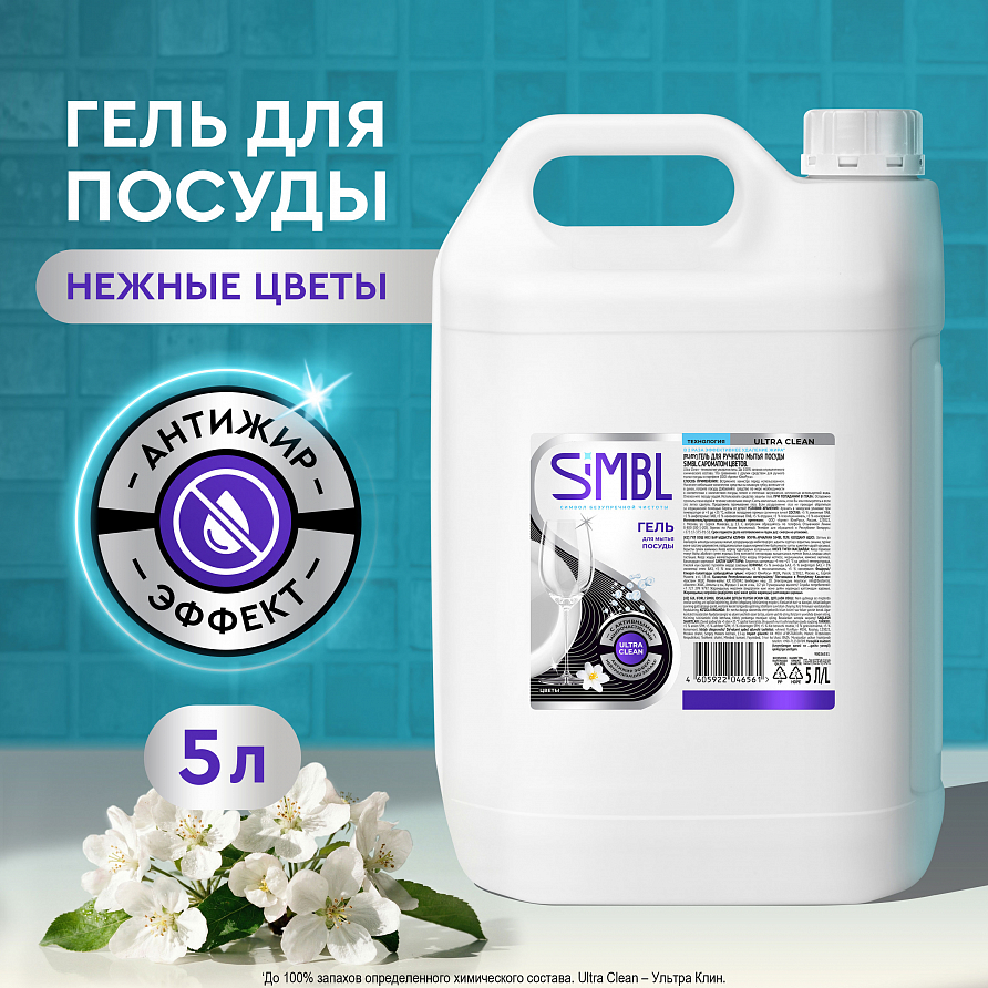 Гель для мытья посуды густой 5 литров Simbl с ароматом «Цветы» - ваш надежный и эффективный помощник в поддержании идеальной чистоты на кухне. Он эффективно очищает посуду от жира, а также подходит для мытья фруктов, овощей и детских игрушек. Моющее средство для мытья посуды разработано с применением уникальной технологии Ultra Clean. Технология Ultra Clean - это гель со сложной многослойной структурой с чередованием активных минеральных перламутровых микрочастиц и мощных очищающих компонентов. Микрочастицы имеют натуральный состав, бережно относятся к любому типу посуды и не царапают ее. Жидкость для мытья посуды в 2 раза эффективнее' удаляет жир и остатки пищи. Гель для мытья посуды обеспечивает 100% растворение жира на посуде без замачивания'' и отмывает загрязнения даже в холодной воде. Средство для мытья посуды жидкое быстро справляется с любыми загрязнениями без лишних усилий. Гель для мытья посуды идеально подходит для ежедневного использования. Средство для мытья детской посуды и бутылочек с эффектом «антижир» нейтрализует стойкие неприятные запахи благодаря особым молекулам с доказанным эффектом’’’. Гель для мытья кухонной посуды с приятным цветочным запахом имеет большой формат упаковки в виде канистры на 5000 мл (5 л), а также вязкую консистенцию и создает обильную густую пену, которые обеспечивают более экономичный и длительный расход. Способ применения: нанесите небольшое количество средства на влажную губку, вспеньте ее в руках, потрите посуду. Добавляйте средство по мере необходимости в соответствии с количеством посуды, типом и степенью загрязнения, жесткостью используемой воды. Ополосните посуду водой. Гели для мытья посуды Simbl - символ безупречной чистоты! 'По сравнению с другим средством для ручного мытья посуды в портфеле ООО "Арнест ЮниРусь". ''По результатам инструментальных тестов ООО "Арнест ЮниРусь". ‘’’До 100% запахов определенного химического состава.